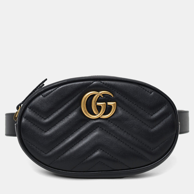 Gucci’s Marmont belt bag in black quilted leather features the signature GG logo and a zip top closure. Perfect for hands free wear, it can be styled at the waist or across the chest.