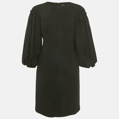 This authentic Alexander McQueen dress brings a sharp black wool crepe base with sculpted puff sleeves for a beautiful silhouette. It feels fitting for dinners, events, or any night when you want something classy.