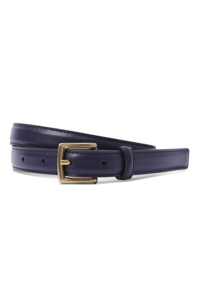 Узкий ремень с тренчиком в тон выполнили из мелкозернистой воловьей наппы. Аксессуар застегивается квадратной штифтовой пряжкой из золотистого металла.