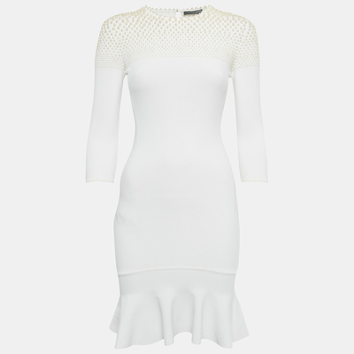 This Alexander McQueen knit mini dress is finished in bright white with small pearls placed closely across the upper bodice and sleeves. The knit holds a smooth, body following shape, and the three quarter sleeves keep the style balanced. A soft flare at the hem adds unexpected allure.