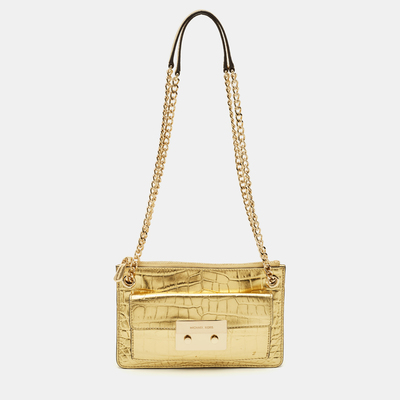 This Michael Kors Sloan comes in metallic gold croc embossed leather, giving it a modern look. The flap front pocket and zip top keep your things secure, and the chain strap sits comfortably on the shoulder. It’s a slim, tidy bag that’s perfect for days when you want to add a bit of shine.