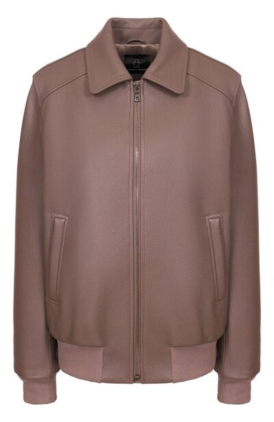 Бомбер из зернистой оленьей кожи дополнили отложным воротником и двумя карманами. Манжеты и широкий пояс выполнили из трикотажа в рубчик. Куртка с утеплителем из шерсти и акрила застегивается молнией.