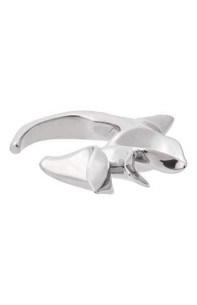 Незамкнутое скульптурное кольцо с листьями, напоминающими языки пламени, вошло в линию «Больше чем любовь». Аксессуар изготовили из латуни, покрытой белым родием.