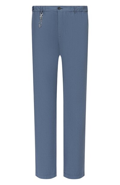 Брюки с потайной кулиской на эластичном поясе сшили из хлопкового поплина. Модель с врезными боковыми карманами и задними на пуговицах дополнили фирменным металлическим брелоком-акулой.