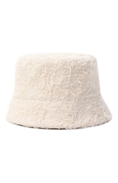 Для создания панамы выбрали фактурный хлопковый деним Fuzzy, созданным в технике punch needle. Поля аксессуара с креповым подкладом декорировали замшевым ярлыком с эмблемой Solomeo.