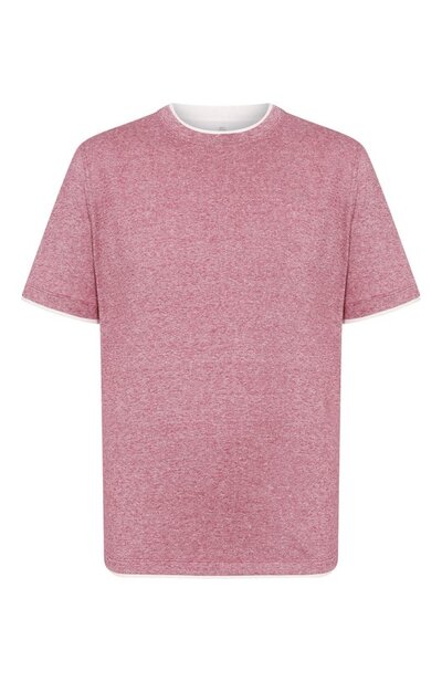 Футболку кроя Regular fit сшили из меланжевого джерси на основе льна и хлопка. Горловину, манжеты и пояс дополнили контрастными вставками, создающими иллюзию многослойности.