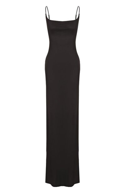 Платье-комбинацию с регулируемыми бретелями выполнили из вискозного атласа. Сбоку приталенную модель дополнили разрезом, открывающим левую ногу.