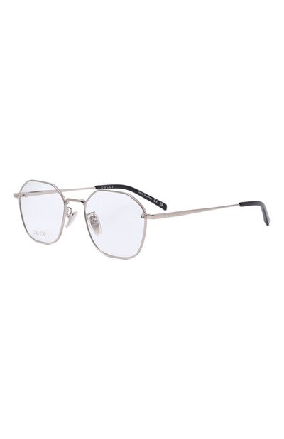 Для создания оправы с шестиугольными демонстрационными линзами выбрали серебристый металл, а для контрастных заушников – глянцевый полимер. Сбоку аксессуар украсили эмблемой Interlocking G, поддержав фирменный декор гравированным логотипом на дужках.