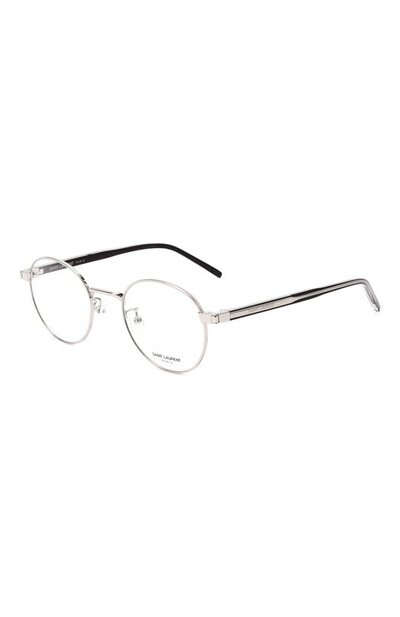 Для создания узкой оправы с круглыми демонстрационными линзами выбрали серебристый металл. Из такого же материала выполнили каркас прозрачных полимерных дужек с логотипом марки.