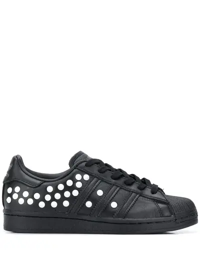 Black leather Superstar low top sneakers from adidas featuring a round toe, a lace-up front fastening, a signature three stripe detail, a polka dot print, a two tone design and a flat sole.