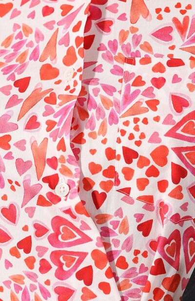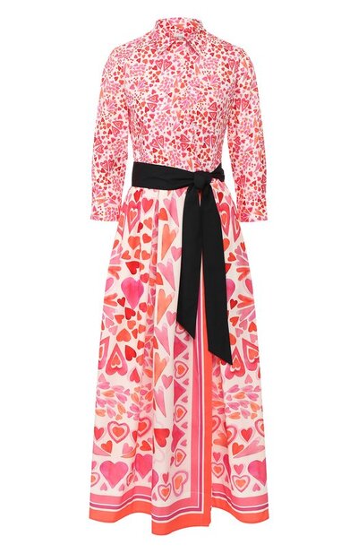 В дизайне платья-рубашки Сара Рока тактично соединила два принта, в основе которого лежит сердце. Объединяющим звеном стал мягкий шелковистый хлопок и цветовая гамма, выстроенная на красном, розовом и оранжевом оттенках. Акцентировать внимание на линии талии поможет широкий черный пояс-лента: он позволяет экспериментировать с внешним видом. Изделие вошло в коллекцию сезона весна-лето.
