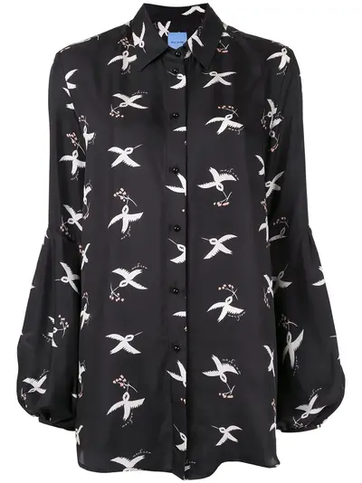 Black and white silk organza St. Clair Bird Print blouse from MacGraw featuring a spread collar, a front button placket, an all-over print, billowing sleeves, fitted cuffs, a back inverted pleat and a curved hem.