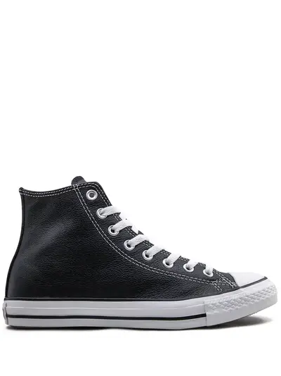 Black leather high top sneakers from Converse featuring a pebbled leather texture, a round toe, an embroidered brand patch, a lace-up front fastening and a flat rubber sole.
