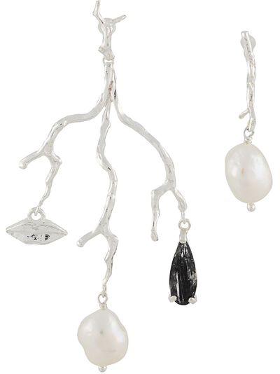 sterling silver Reves de Reves branch earrings from Wouters & Hendrix featuring a drop crystal pendant, tourmaline quartz details and fresh water pearls. These earrings come as a pair.