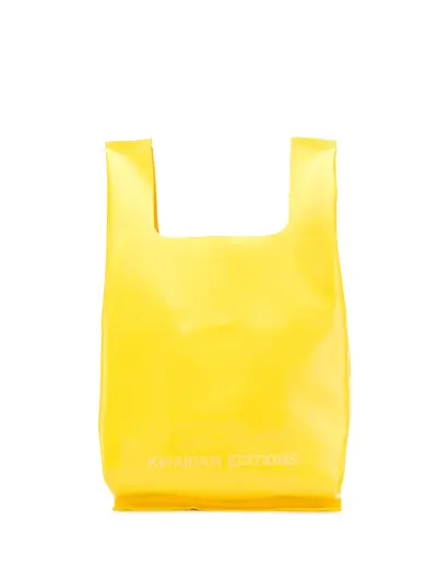 Vibrant yellow shopping tote bag from Kwaidan Editions featuring a front embossed logo stamp, an open top design, top handles and a main internal compartment. POSITIVELY CONSCIOUS: KWAIDAN EDITIONS scores 4 out 5 by independent ethical brand rating agency Good On You. It traces and audits all of its supply chain to ensure good labour standards and it doesn't use many animal products in its collections (aside from wool).