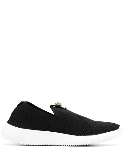 Black Lorna slip-on sneakers from Kurt Geiger London featuring a round toe, mesh panels, a signature gold-tone eagle at the front centre and a flat sole.
