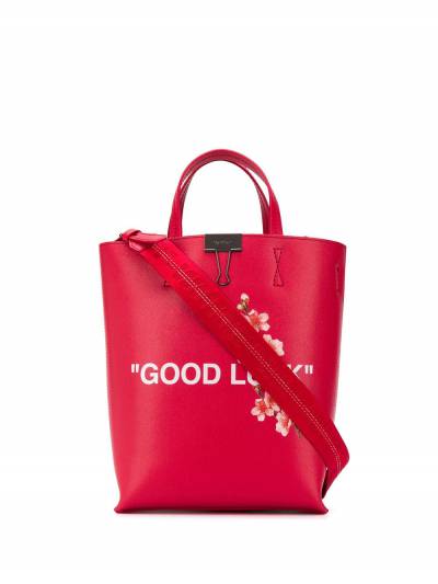 In the Chinese culture, peach blossoms represent romance, prosperity and growth. Crafted from leather, this red tote from Off-White is decorated with a white printed "Good Luck" slogan and pink peach blossoms to the front. What better way to start the new year than with a brand new bag? Featuring a detachable and adjustable logo tape shoulder strap, round top handles, an open-top design, a main internal compartment, an internal zipped pocket, an internal logo stamp and a logo-engraved silver-tone binder clip.