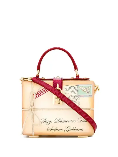 beige/red wood hand-painted letter print leather trim gold-tone hardware single top handle adjustable detachable shoulder strap padlock detail front clasp fastening internal slip pocket internal logo stamp leather lining metal feet