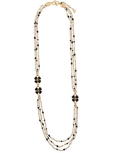24kt gold plated brass Trèfle sautoir necklace from Goossens featuring a chain strap, a pearl embellishment, crystal embellishments, an S clasp, three black agate clovers with a central freshwater baroque pearl and an extension chain of 6,5 cm, adorned with rock crystal and freshwater pearls and a Goossens tassel.