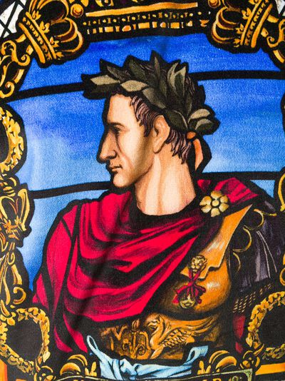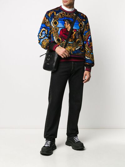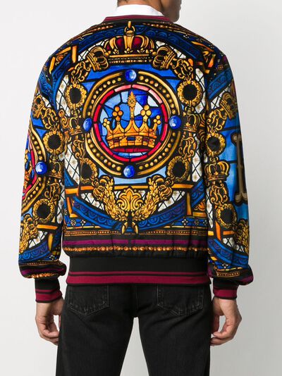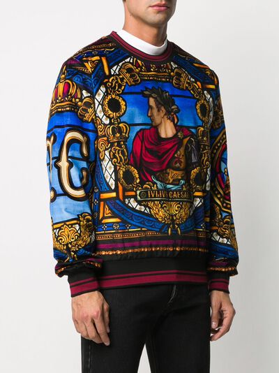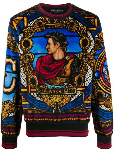 В поисках вдохновения Доменико Дольче и Стефано Габбана обращаются к мировой истории. Принты с изображением королевских особ и правителей украшают рубашки, кардиганы и брюки из коллекции Dolce & Gabbana (Дольче энд Габбана) весна-лето 2020. Среди них разноцветная толстовка с принтом Julius Caesar, напоминающим витражные стекла. Модель выполнена из хлопка и эластичного шелка и имеет круглый вырез, длинные рукава и свободный крой.