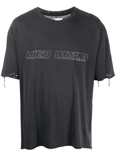 Black cotton distressed T-shirt from Alchemist featuring a round neck, short sleeves, crystal embellishments and a raw uneven hemline.