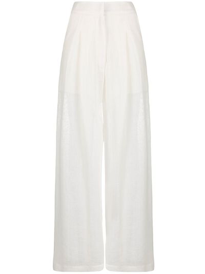 White linen Sohag high waisted pants from Le Kasha featuring a high waist, a hook and zip fly, a flared style, a long length and a lightweight construction. POSITIVELY CONSCIOUS: At least 50% of the main material of this product meets our conscious criteria: for example, it's either organic, recycled, upcycled, or independently recognised as being better for the environment (such as linen, ramie, Tencel, etc.).
