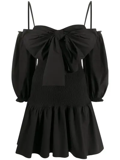 black stretch-cotton bow detailing elasticated cuffs sweetheart neck rear zip fastening off-shoulder spaghetti straps long puff sleeves thigh-length