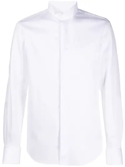 White cotton long sleeve tailored shirt from Xacus featuring a pointed collar, a front button fastening, long sleeves, button cuffs and a straight hem.
