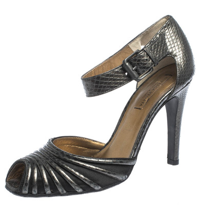 These stylish and classy sandals come from the house of Bottega Veneta. Crafted from grey python embossed leather and satin, they are styled with peep toes. They have covered counters, buckled ankle straps, 10 cm heels and insoles carrying the brand label. They are finished with leather soles.