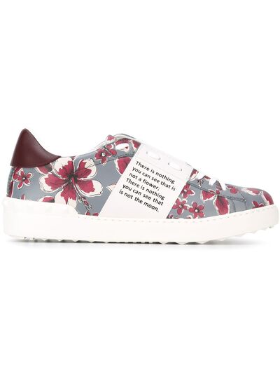 Isn't it about time you let your shoe closet bloom? Add these grey and red calf leather Open floral-print sneakers from Valentino Garavani into the rotation and witness how your outfits suddenly blossom to life. Don't let anything stop you from planting these beauties into your wardrobe today. Featuring a round toe, a lace-up front fastening, a brand embossed tongue and a flat rubber sole.