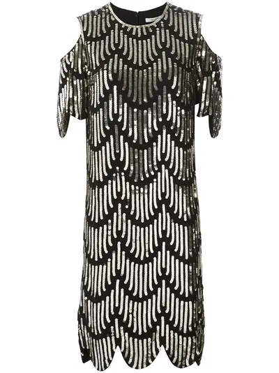 Black silk cocktail dress from Givenchy featuring a round neck, a cut out detail, short sleeves, a loose fit, sequin embroidery, a curved hemline and a back zip fastening.