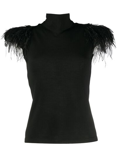 Black silk and virgin wool blend feather trim top from Alberta Ferretti featuring a turtle neck, short sleeves and a straight hem.