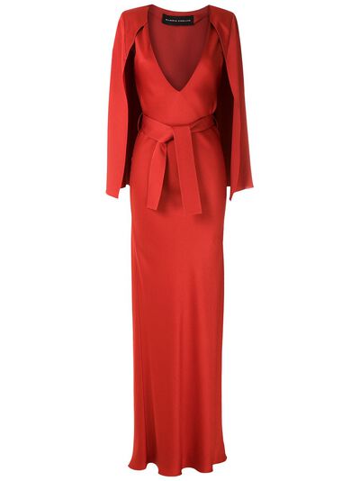 Red cape long dress from Gloria Coelho featuring a v-neck, a tie waist, a long length and a slim fit.