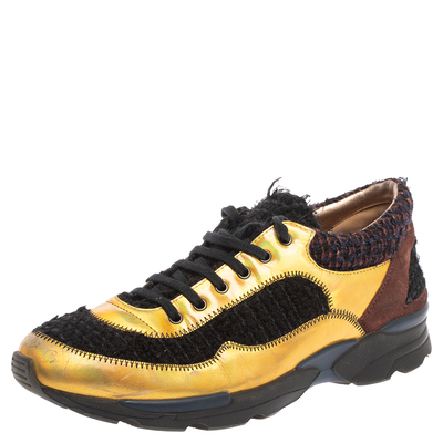 These sneakers from Chanel are amazingly stylish The exterior of the sneakers flaunts a mix of materials like tweed, suede and metallic leather and multicolored hues while featuring a sturdy silhouette and CC logo on the counters. They come equipped with comfortable leather lined insoles, laced vamps, and tough rubber soles.