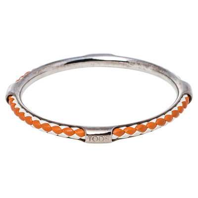 Beautify your wrist with this lovely bangle bracelet from Tods. The piece has been crafted from gold tone metal and woven leather. Complete with the iconic label engraved on it, this bracelet is easy to slip on and off.
