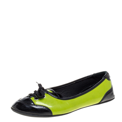Look chic and fashionable in this pair of ballet flats from Dolce and Gabbana. They have been crafted from green and black patent leather and designed with the art of fine stitching and lace details on the uppers. The pair is complete with comfortable leather insoles and durable rubber soles.