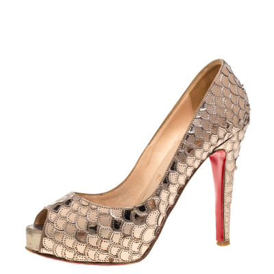 Shine your way to every gathering in these pumps from Christian Louboutin. Glamorously designed with PVC in a scaled pattern, along with peep toes and 11.5 cm heels, this metallic beige pair will bring high glitz to your style.