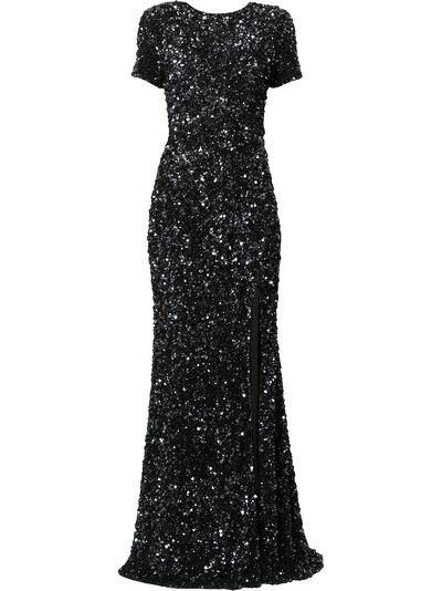 black sequin embellishment crew neck V-back rear zip fastening short sleeves front slit extra-long length