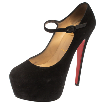 Take your love for Louboutins to new heights by adding this gorgeous pair to your collection. The pumps simply speak high fashion in every stitch and curve. The exteriors come made from suede in a mary jane style and the pumps are finished with platforms, 15.5 cm heels, and the famous red soles.
