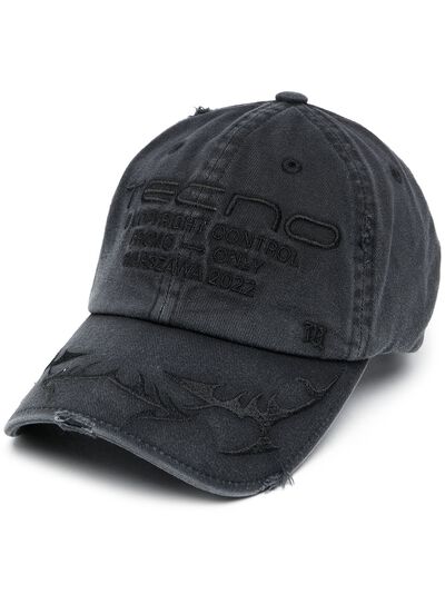 washed black cotton embroidered motif distressed effect curved wide brim adjustable fit