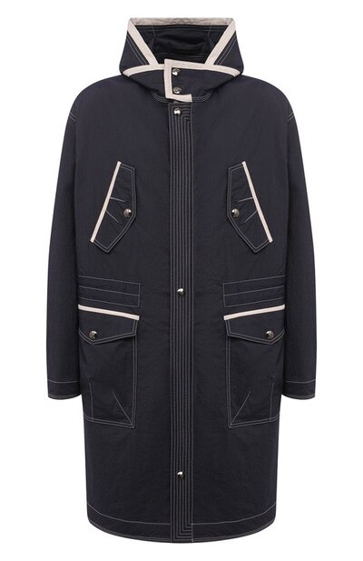 Парку с контрастной отделкой выполнили из стрейчевой ткани на основе полиамида. Модель со спущенной линией плеч и капюшоном, интегрированным в воротник-стойку, дополнили нагрудными и накладными боковыми карманами с клапанами на кнопках.