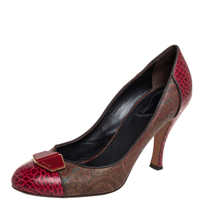 Add a luxe finish to your ensemble with this pair of pumps from the house of Etro. Finely crafted from paisley coated canvas and croc embossed leather, these shoes will offer comfortable support. The round toe pumps are set atop 11 cm heels.