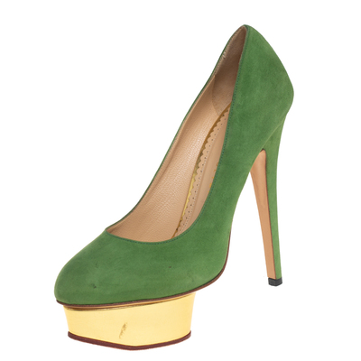 Own this meticulously designed pair of Charlotte Olympia pumps today and dazzle everyone whenever you step out Crafted out of green suede and exhibiting almond toes, these pumps are from their Dolly collection. They are lined with leather on the insoles and have been beautified with 14 cm high heels and solid platforms.