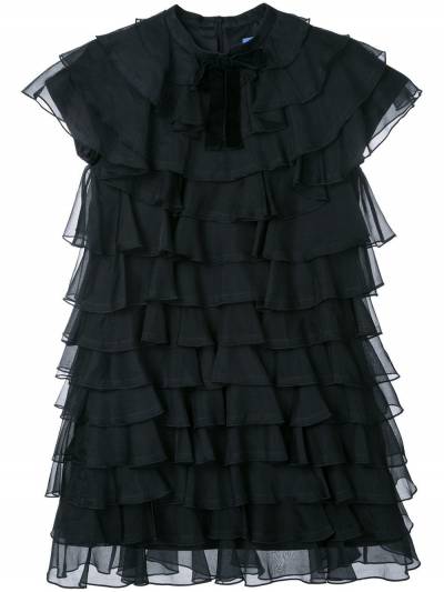Black silk Bon Bon silk dress from MacGraw featuring a ruffled design, short sleeves, a tiered design, silk organza ruffles and a high neck.