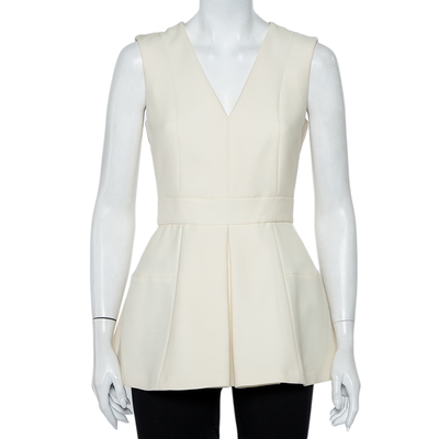This top from Alexander McQueen exhibits smart tailoring and a delicate design. This sleeveless top, made of cream colored fabric, features a flattering peplum silhouette. Completed with a v neckline, wear this with cropped, fitted pants and complementing pumps.