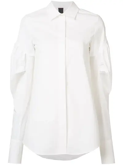 White cotton shirt from Vera Wang featuring a classic collar, a concealed front button placket, elongated puff sleeves and a curved hemline.
