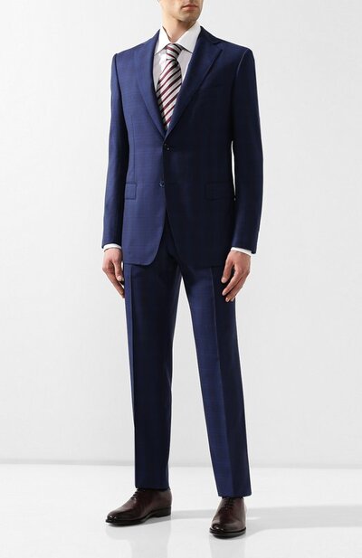 Синий костюм в клетку «Принц Уэльский» будет уместно смотреться и днем в офисе, и вечером в пабе. Для создания пиджака с узкими лацканами и прямых брюк со стрелками мастера использовали мягкую тонкую шерсть, которая почти не мнется и не пилингуется со временем. Ансамбль вошел в коллекцию сезона весна-лето.