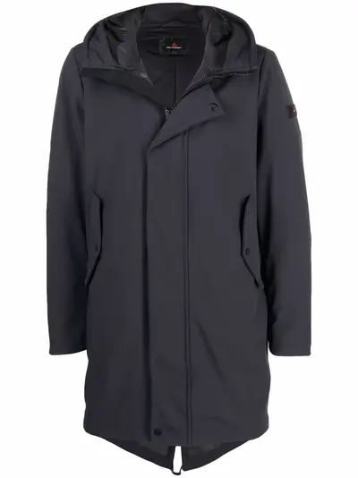 Navy blue logo patch hooded coat from PEUTEREY featuring logo patch at the sleeve, classic hood, toggle fastening, concealed front zip fastening, long sleeves and two side button-fastening pockets.
