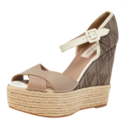 These Valentino wedges will make you stand out wherever you go They are made from fabric and leather and come in a spectacular beige brown design. These open toe sandals feature straps at the vamps and ankle straps with single buckle fastenings. They come with 13 cm wedge heels and leather lined insoles.