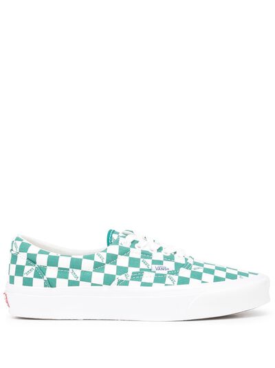 cadmium green/white canvas bold check pattern round neck front lace-up fastening branded insole flat rubber sole